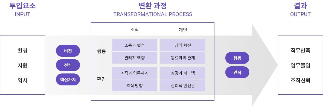 직무만족, 업무몰입, 조직신뢰 등 결과를 얻는데 필요한 변환 과정을 통합적 관점에서 측정합니다