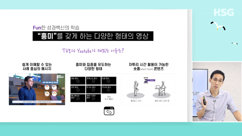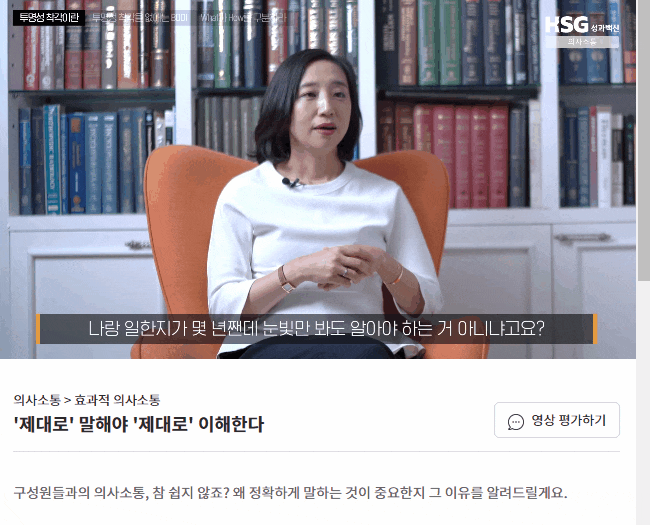 맞습니다. 그래서 성과백신의 영상은 ‘짧고 재미있게’를 지향합니다. 한 개 영상의 절대 시간이 길지 않습니다. 짧은 건 4분, 길어도 8분을 넘지 않아요. 그래서 회의 기다리다가, 혹은 출퇴근길에, 금방 볼 수 있기 때문에 학습자들의 접근성이 훨씬 높아집니다. 그리고 유튜브 예능 보듯이 배꼽 빠지게 재미있진 않지만 ^^;; 고리타분한 학습 영상으로 보이지 않으려고 노력하고 있습니다. (영상 샘플 보기)