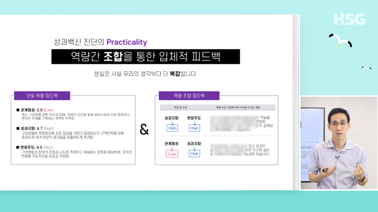한 문장으로 정의하면 이렇습니다. “개개인이 진단을 하고 진단 후에 알고리즘을 통해 파악된 부족한 점을 개인별로 맞춰진 영상 콘텐츠를 학습하는 것.” 이게 HSG가 만든 성과 백신입니다.