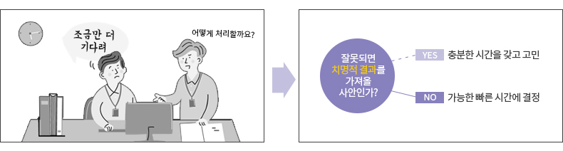 결정해야 할 수많은 문제들을 하나 하나 다 따져가며 판단하는 건 사실 불가능합니다. 그래서 아마존의 CEO 제프 베조스는 문제 상황에 대해 한 가지 질문을 던집니다. “이번 결정이 잘못됐을 때 치명적 결과를 가져올 사안인가?” 만약 이 질문에 대한 답이 Yes 라면 충분한 시간을 갖고 고민을 합니다. 하지만 그렇지 않다는 답이 나온다면 가능한 빠른 시간에 결정을 합니다. 놀라운 것은, 조직에서 생기는 문제의 90% 이상이 후자, ‘빨리’ 결정해 줄 수 있는 사안이라는 점입니다. 빠른 결정 때문에 비록 차선의 결정이 이뤄지더라도, 그게 시간을 끄는 것보다 더 생산적이라는 게 베조스의 생각입니다.