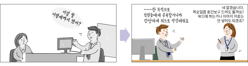 여기에는 쌍방의 노력이 함께 필요합니다. 리더는 가능한 구체적인 방향을 제시해야 합니다. 막연히 ‘잘 해 봐’가 아닌, 어떤 목적으로, 누구를 대상으로, 어떤 형태로 정리하는 게 필요한 지 알려야 합니다.