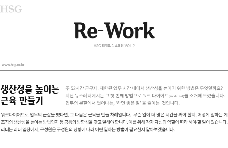 일을 ‘다시’ 생각해 보자는 의미의 Re-Work. 이것은 그리 거창한 게 아닙니다. 일의 ‘기본’과 ‘핵심’을 생각해 보자는 게 그 출발점입니다. 내 업무의 기본은 무엇인지, 이를 통해 달성해야 할 핵심 성과는 무엇인지, 각자의 자리에서 이를 고민해 보는 게 중요한 이유입니다.
