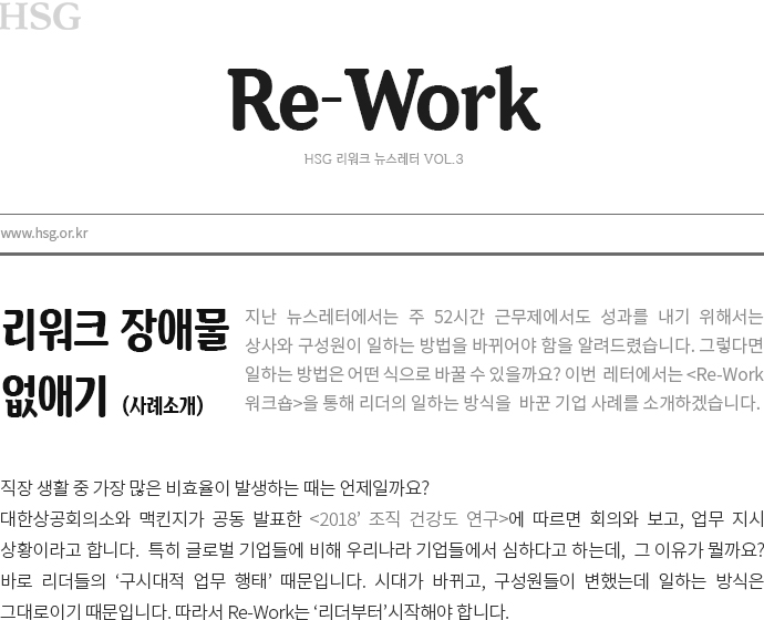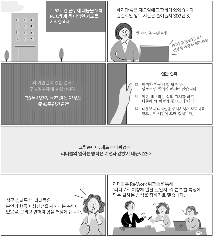 은 각 회사의 사정에 맞게 설계되어 진행됩니다. 그러나 공통적으로 중요한 것은 새로운 일하는 방식을 정착시키는 데 그 무엇보다 리더의 역할이 중요하다는 인식을 함께 하는 것입니다. 시대 변화와 구성원의 변화에 발맞춰 리더의 일하는 방식이 변했을 때, 비로소 Re-Work가 조직에 성공적으로 정착될 수 있습니다.